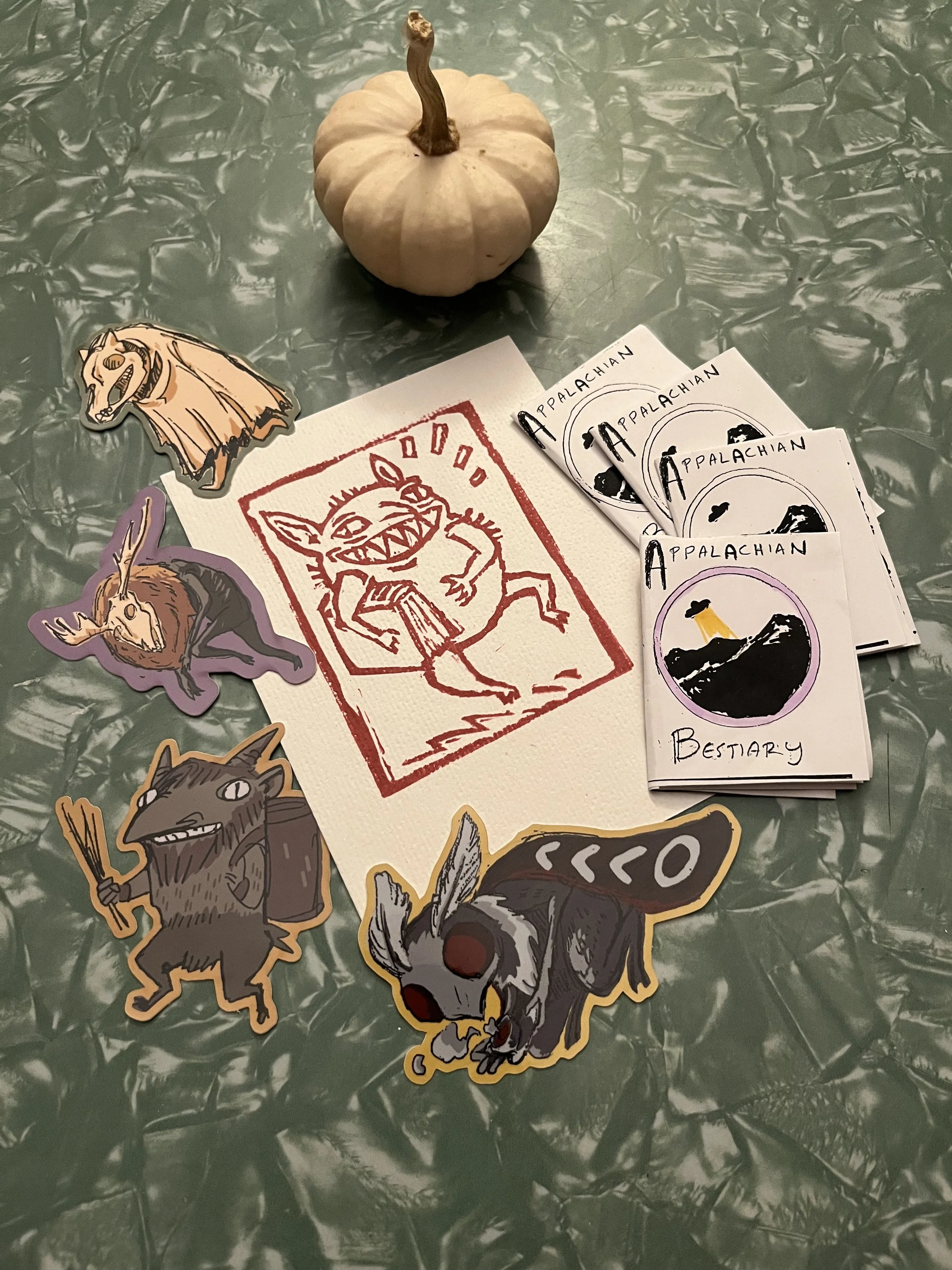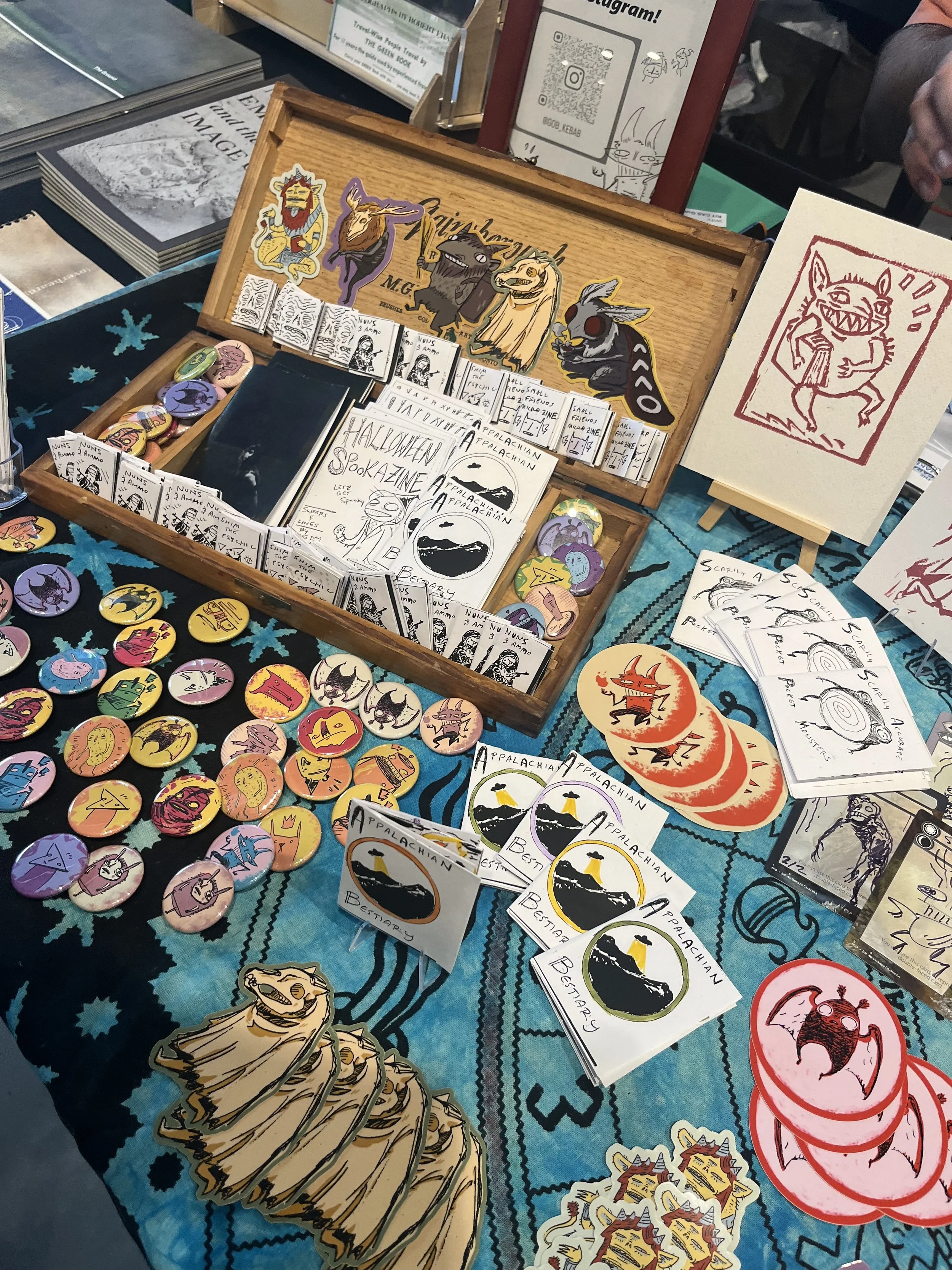 Alex Kurland makes tiny micro-zines, stickers, lino-prints, greeting cards, and art on the fly. If you like monsters, robots, cryptids, and puns (and tiny tiny things) then be sure to stop by and nab some cool gifts for friends. You can find some of his work on Instagram @gob_kebab