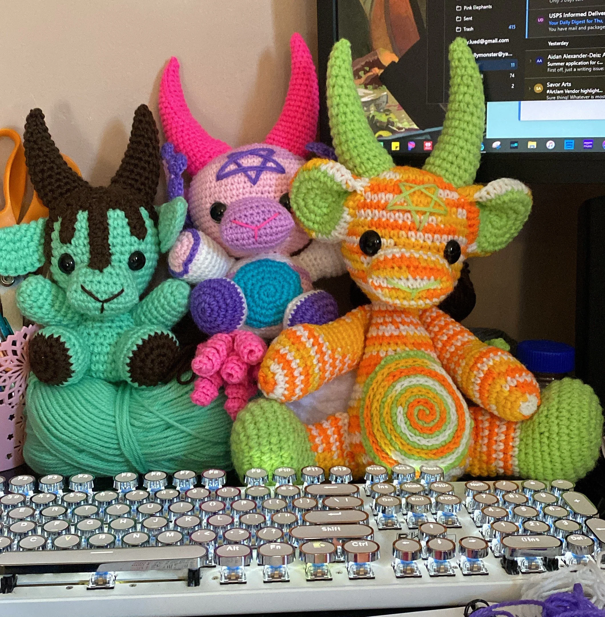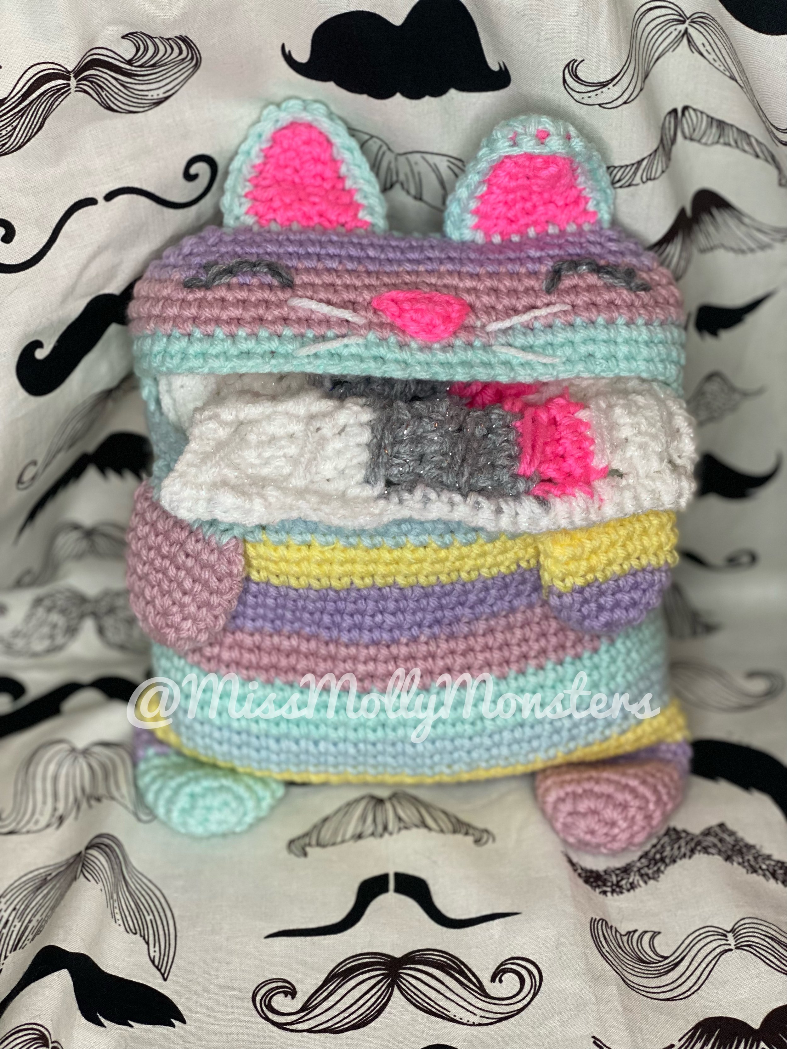 "What have you made the most of?" That would be Rainbow cat barf scarves or some variation of barfing scarf. According to Etsy I've made 140 of these since I posted them about 5 years ago (seemed like a good Covid activity I guess? ). I would add about 25 on top of it to account for one offs along with customs and commissions I have receive through Instagram. I even made a couple teddy bear scarves! Some of my favorite scarves to make are memorials of their beloved felines by using the pictures I'm sent. Nothing better than seeing the look on someone's face when I know I've got it right.