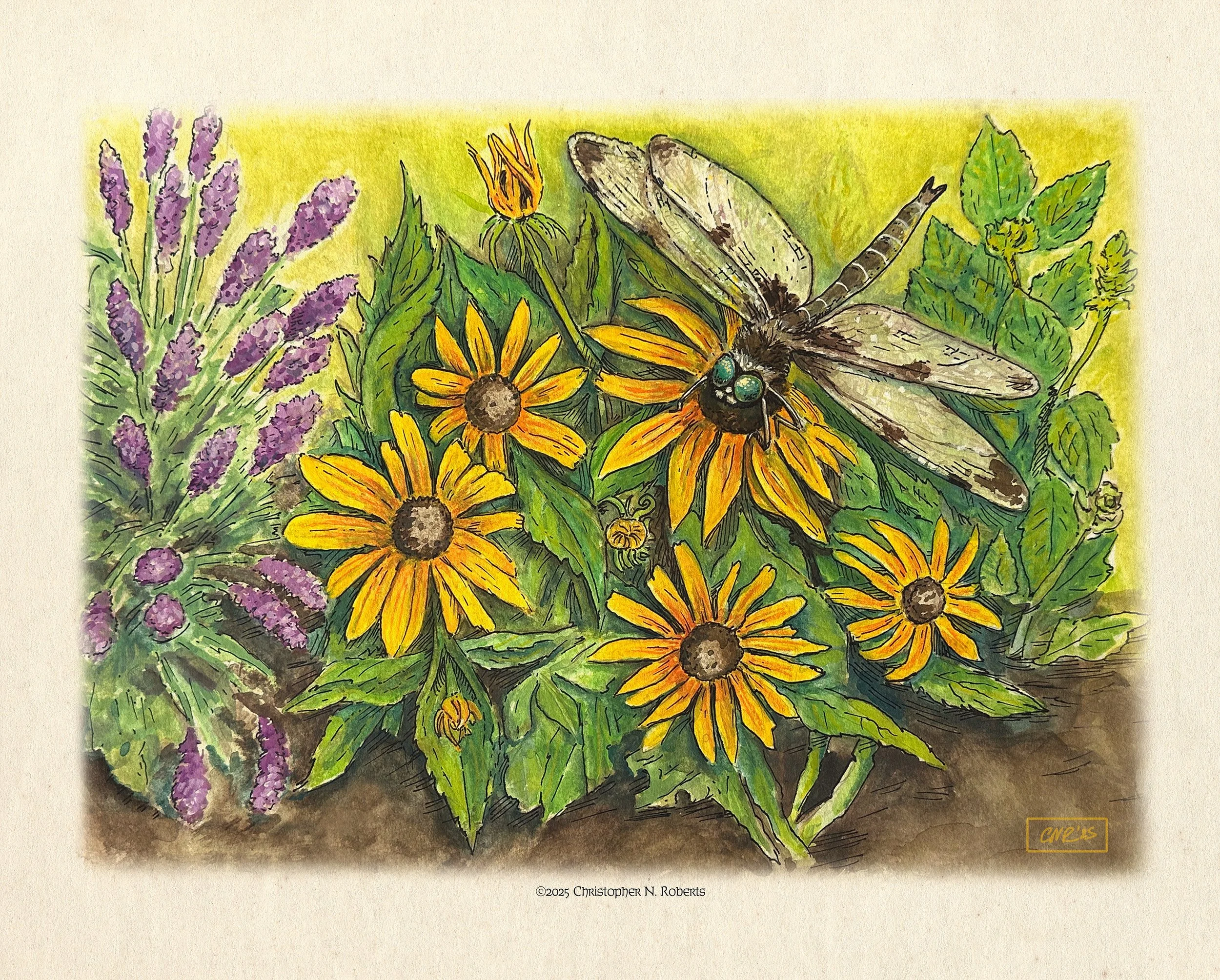 I have a few pieces that I feel good about in retrospect. For whimsical natural science, I like the composition and execution of Dragonfly’s Garden as a painting, and to the Bass & Lure for its unfettered pen-and-ink energy and two-way perspective. For pure natural science, I’d point to my African monarch. Honorable mentions go to the double onions, cardinals, and the zinnia study.